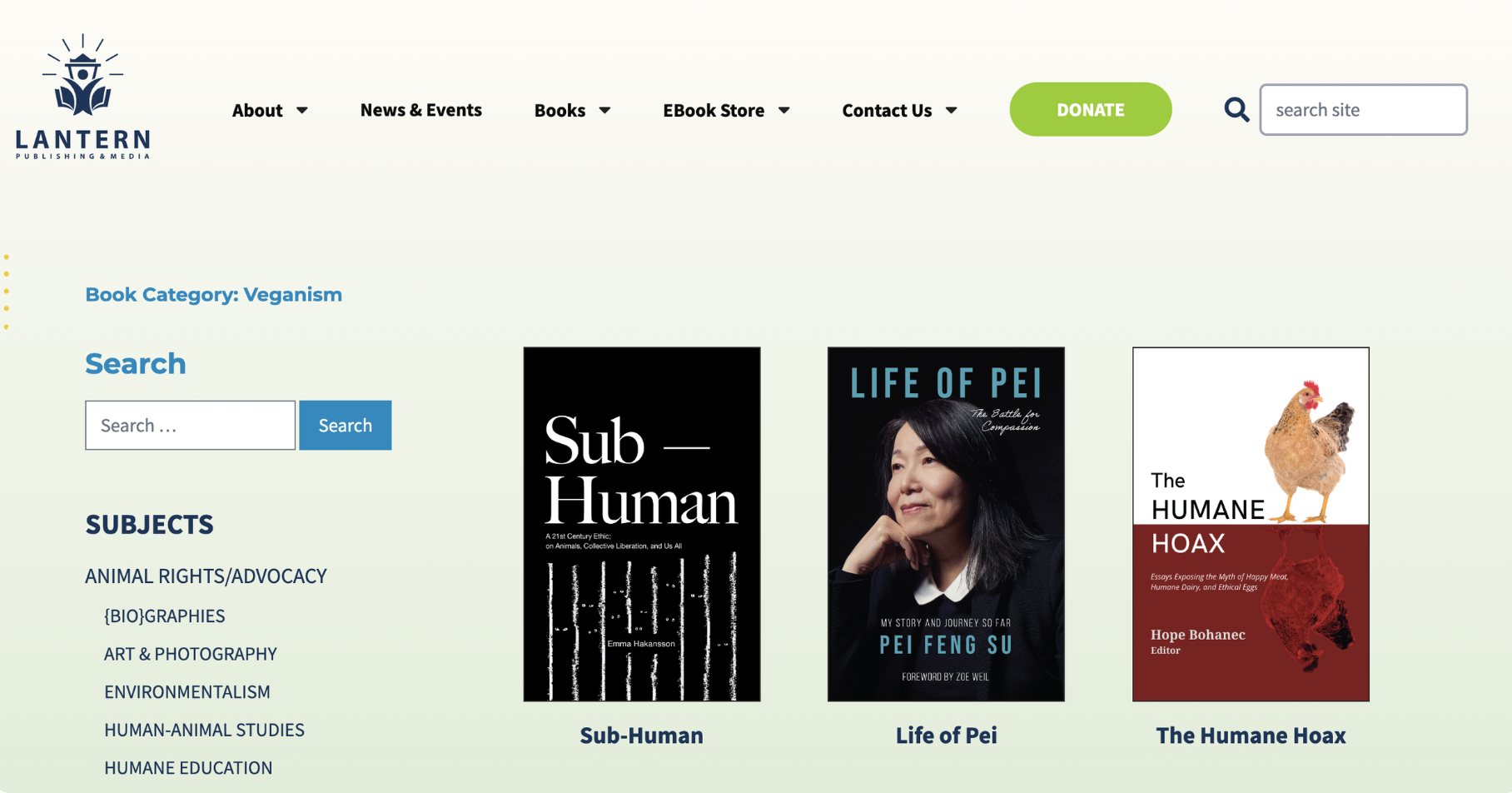 Lantern Publishing & Media home page showing animal rights books. Image source: Lantern Publishing & Media