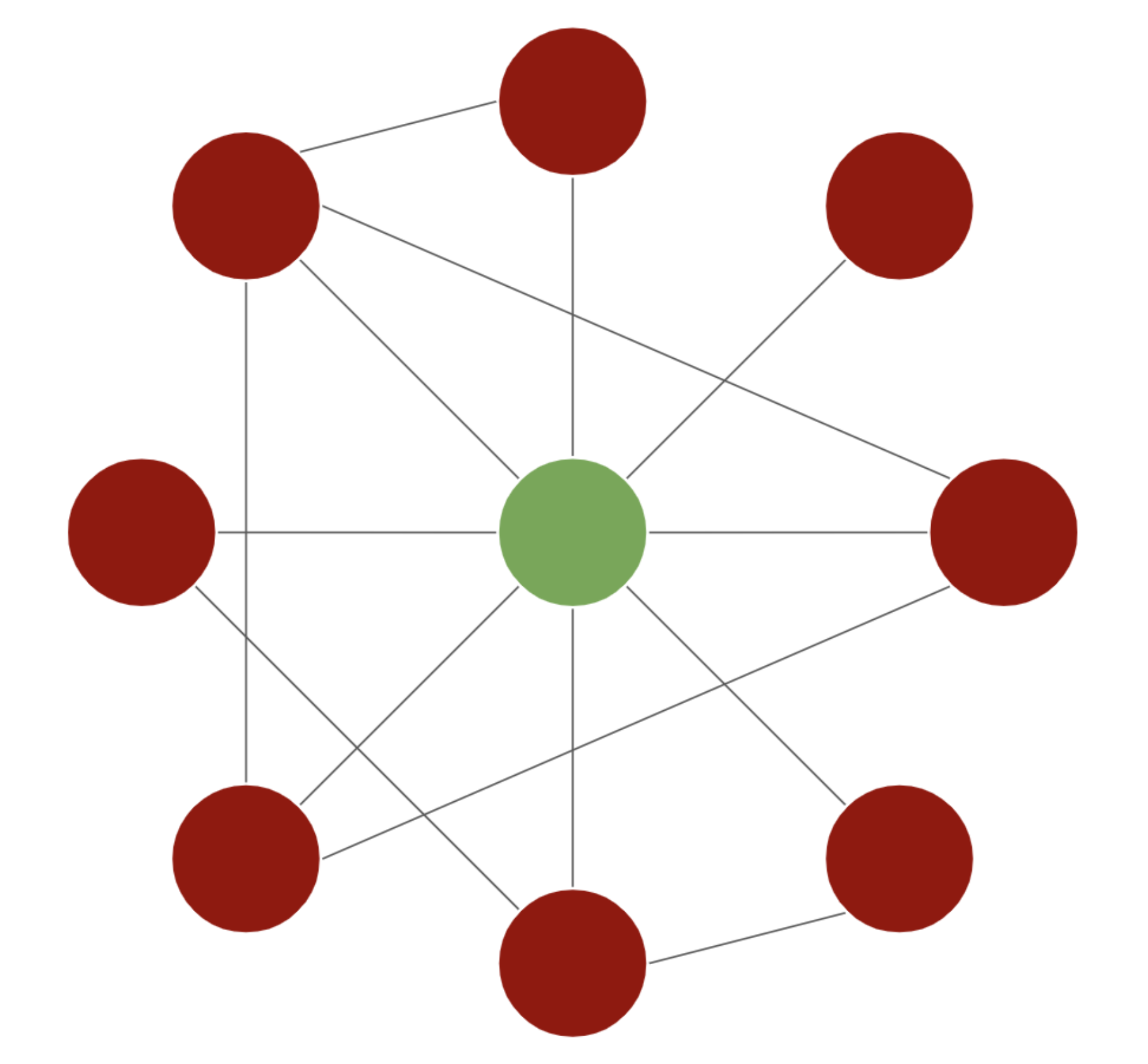 A social network showing a green dot (representing a vegan) surrounded by red dots (representing nonvegans). Image source: Connect For Animals, Steven Rouk presentation about social influence in animal advocacy.